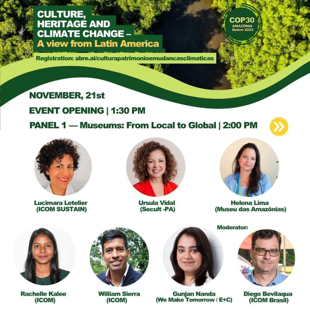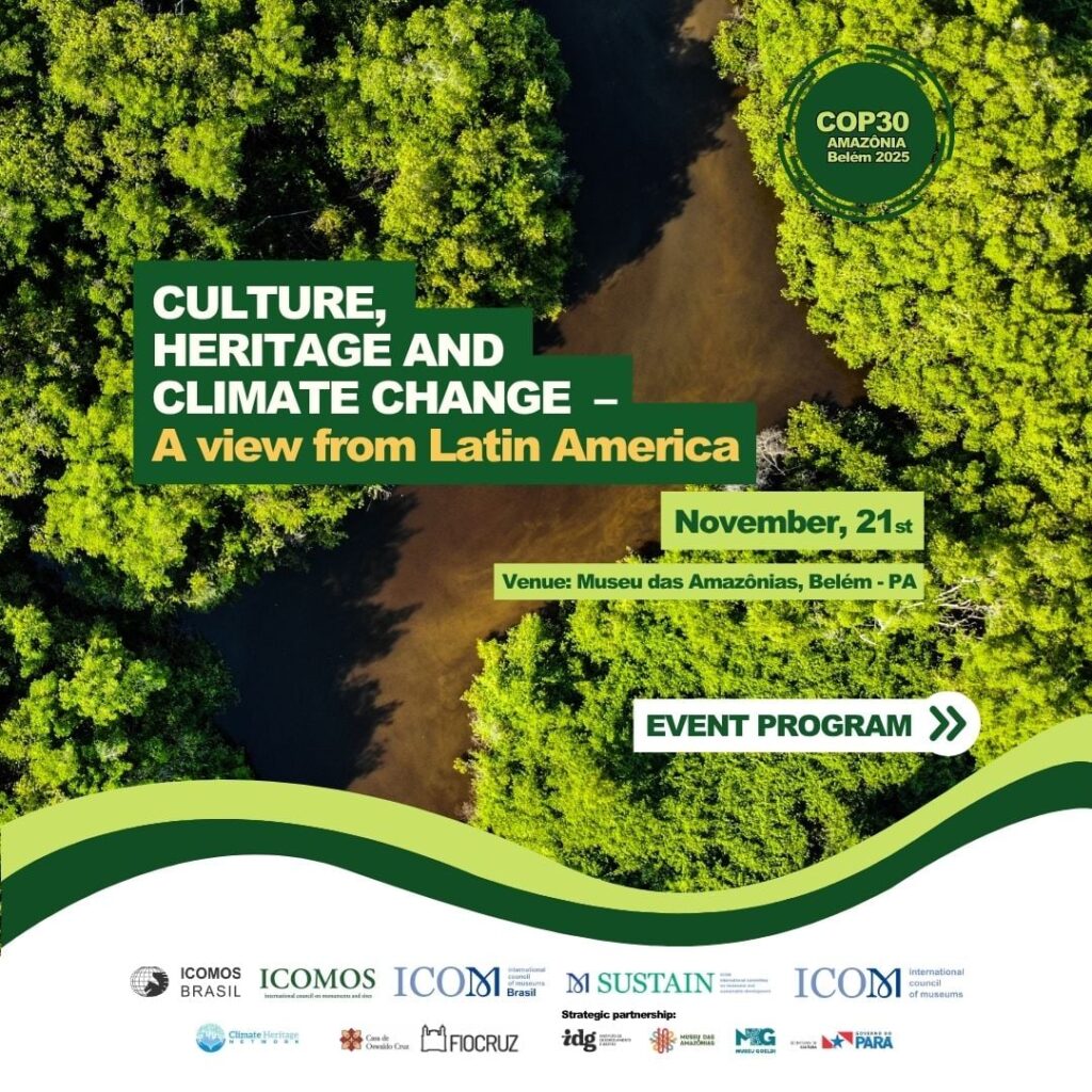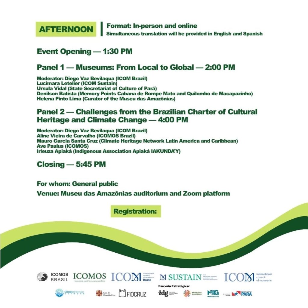 👉🏽 This event is organized by ICOM, ICOM Brazil, ICOM SUSTAIN, ICOMOS, ICOMOS Brazil, the Climate Heritage Network, and Casa de Oswaldo Cruz (COC/Fiocruz), in partnership with the Museu das Amazônias – State Secretariat of Culture of Pará (Secult-PA) / IDG and the Museu Paraense Emílio Goeldi.